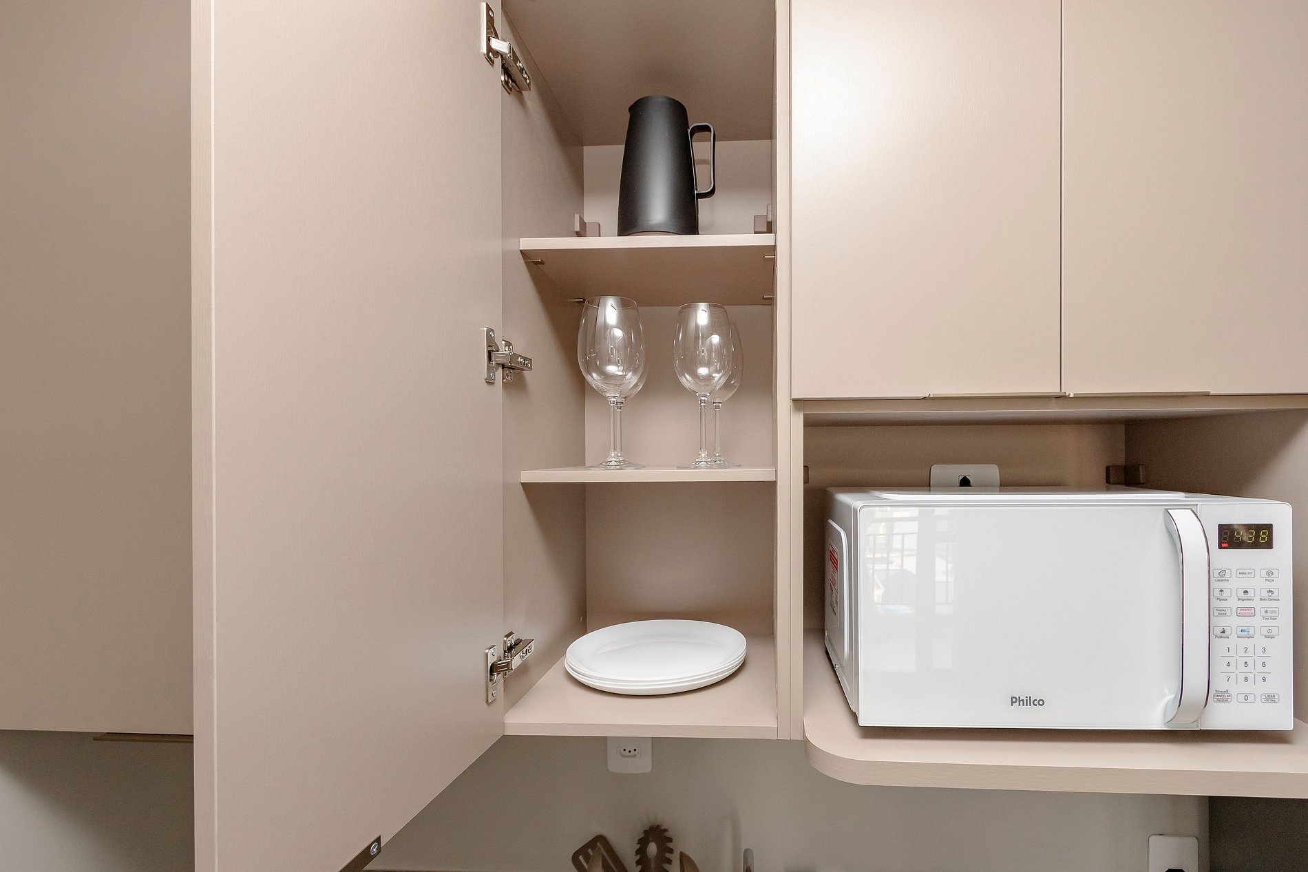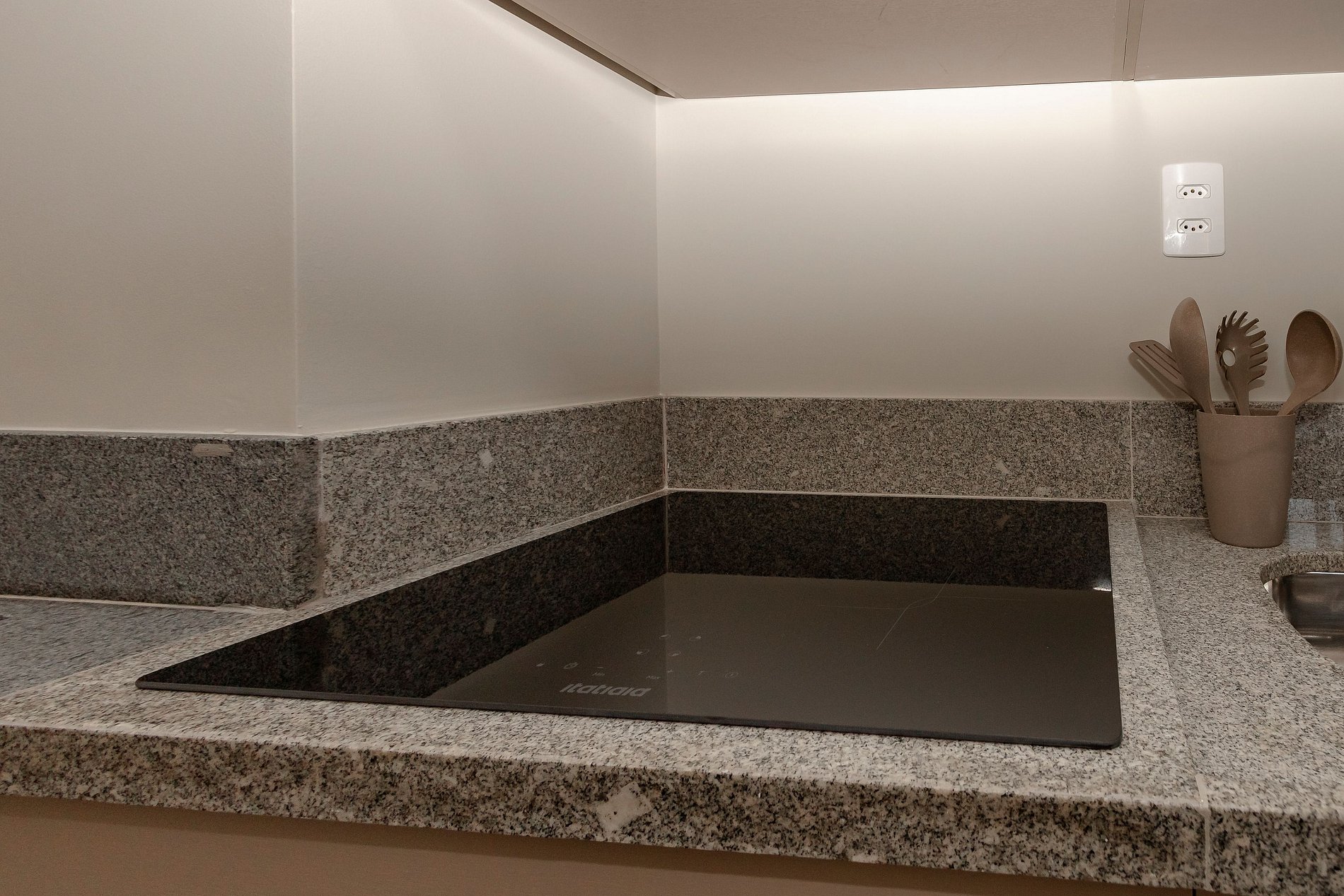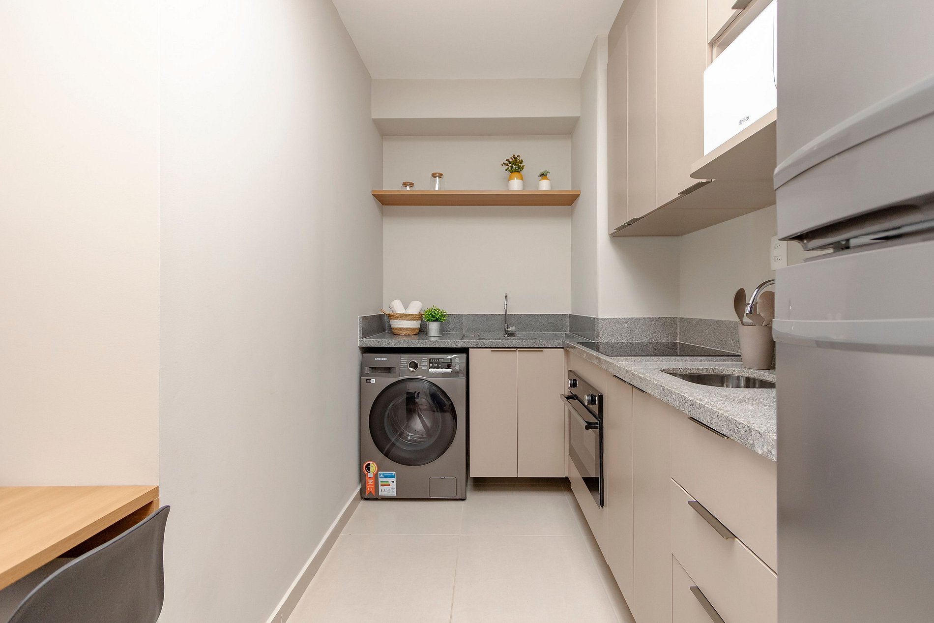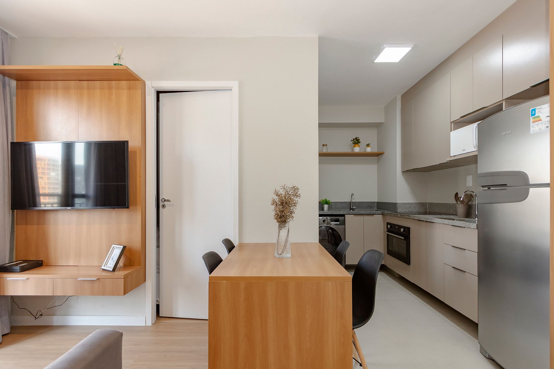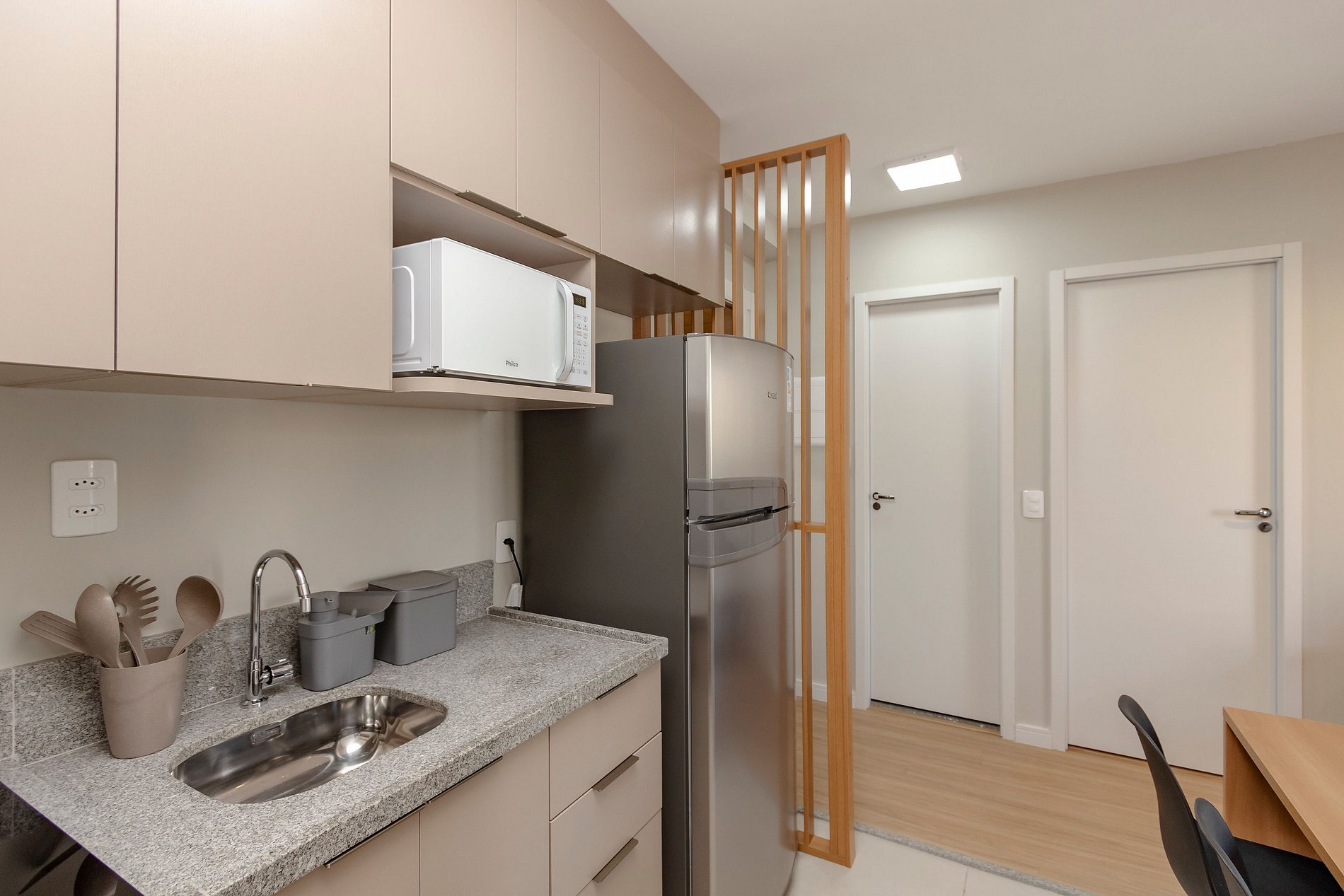 Cozinha Completa, com Geladeira, Cooktop, forno, Microondas e cafeteira.