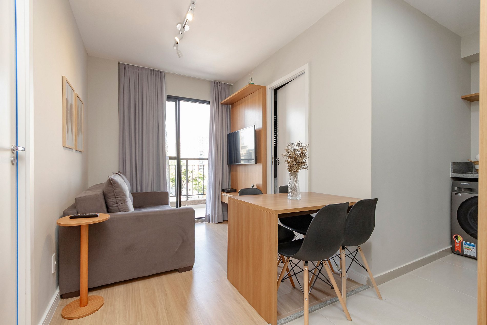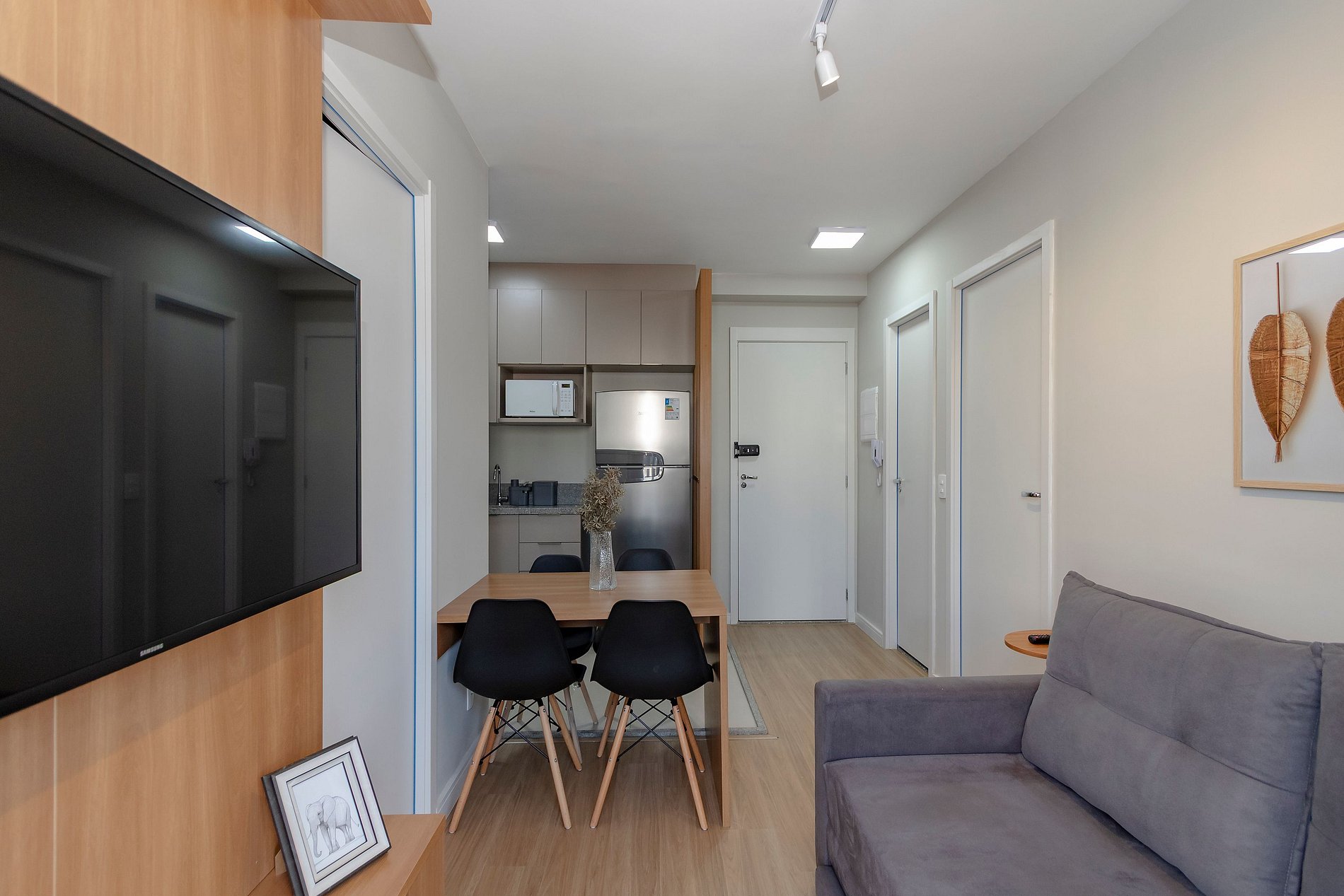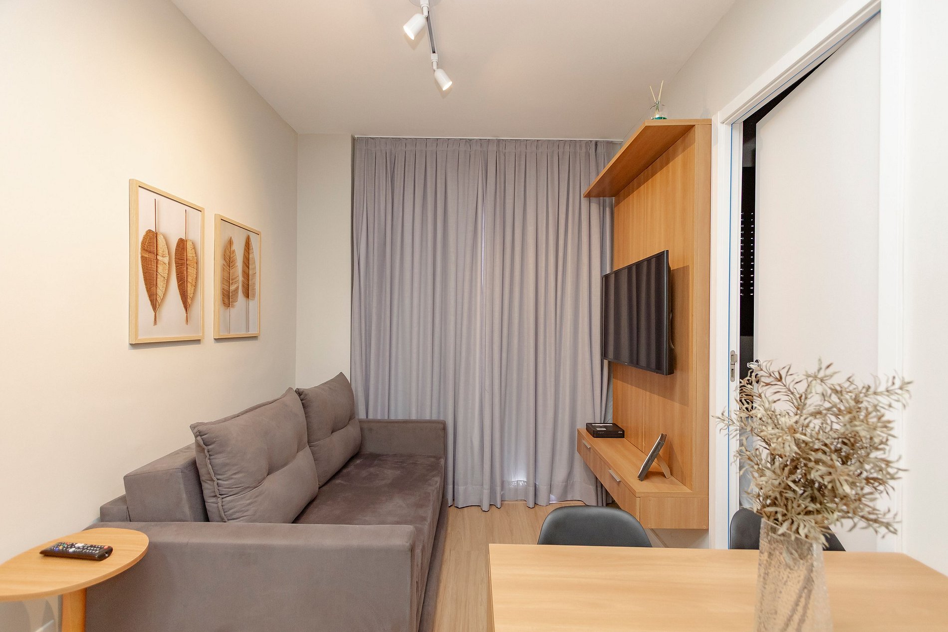 Sala - Sofá, TV Smart e Varanda.