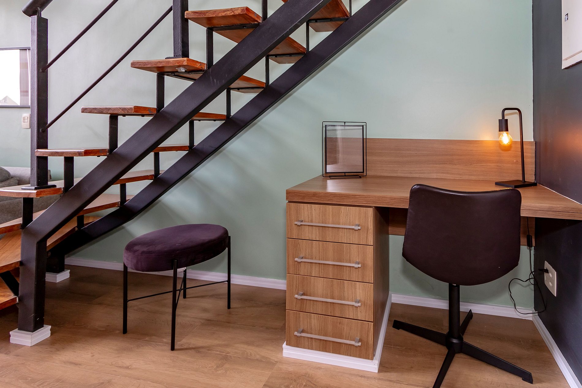 — Unidade com mezanino, quarto fica no segundo andar, necessário subir escadas. Andar superior tem em media 1.50 de altura.
